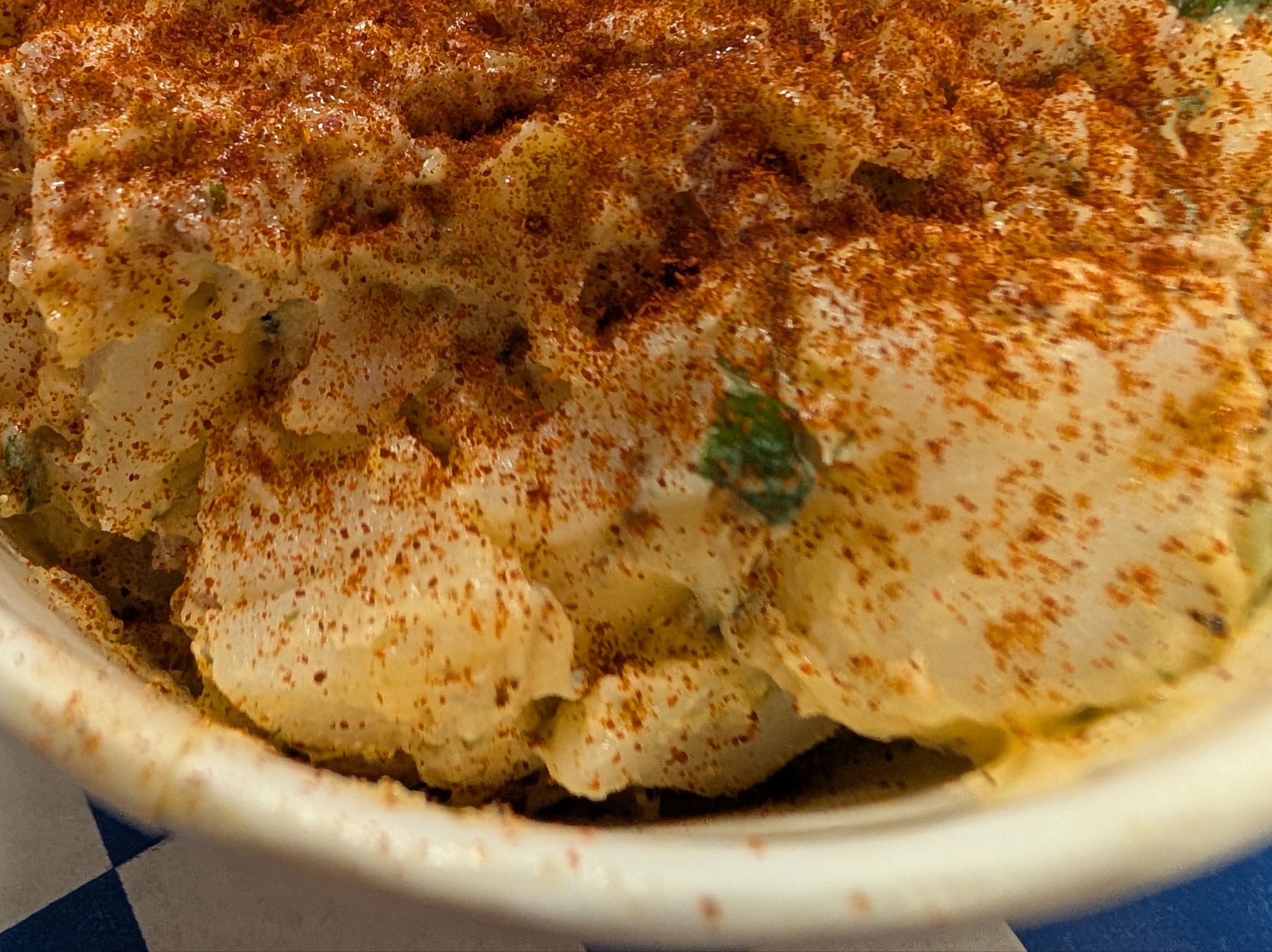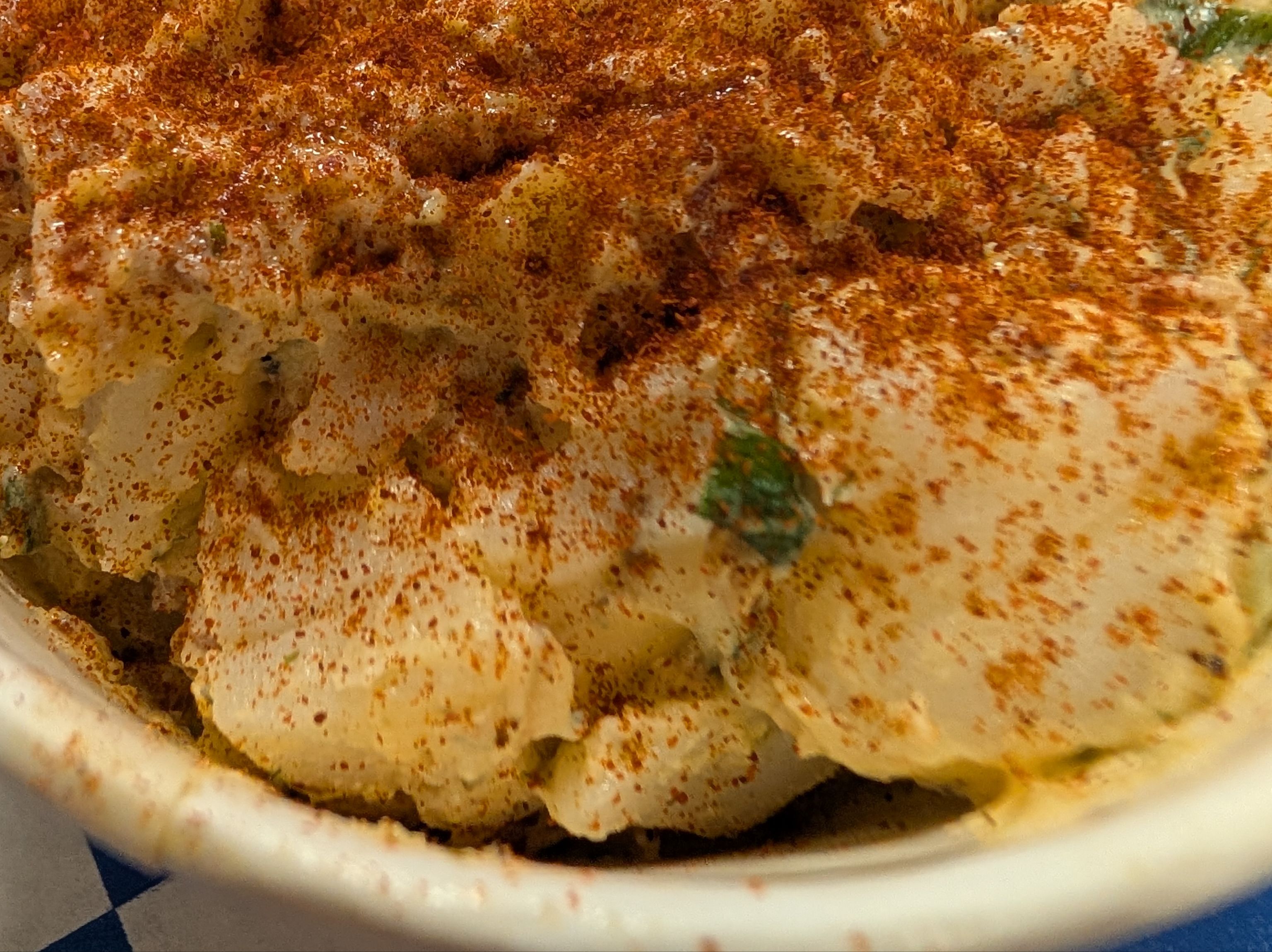 Our signature homemade potato salad with egg yolk aioli, bacon and onions.