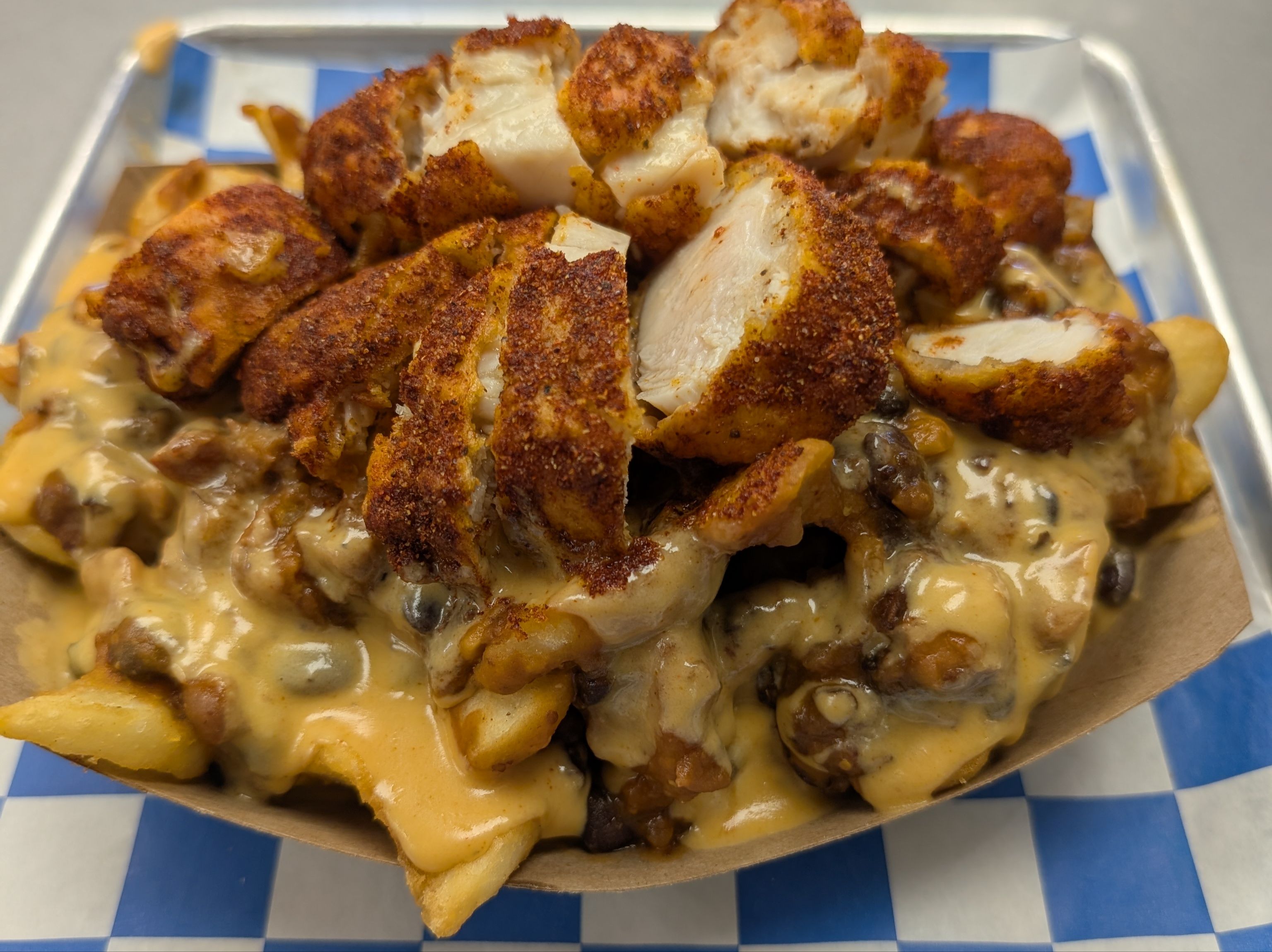 Our fries topped with the cowboy beans and cheese sauce. Top with a chopped tender.