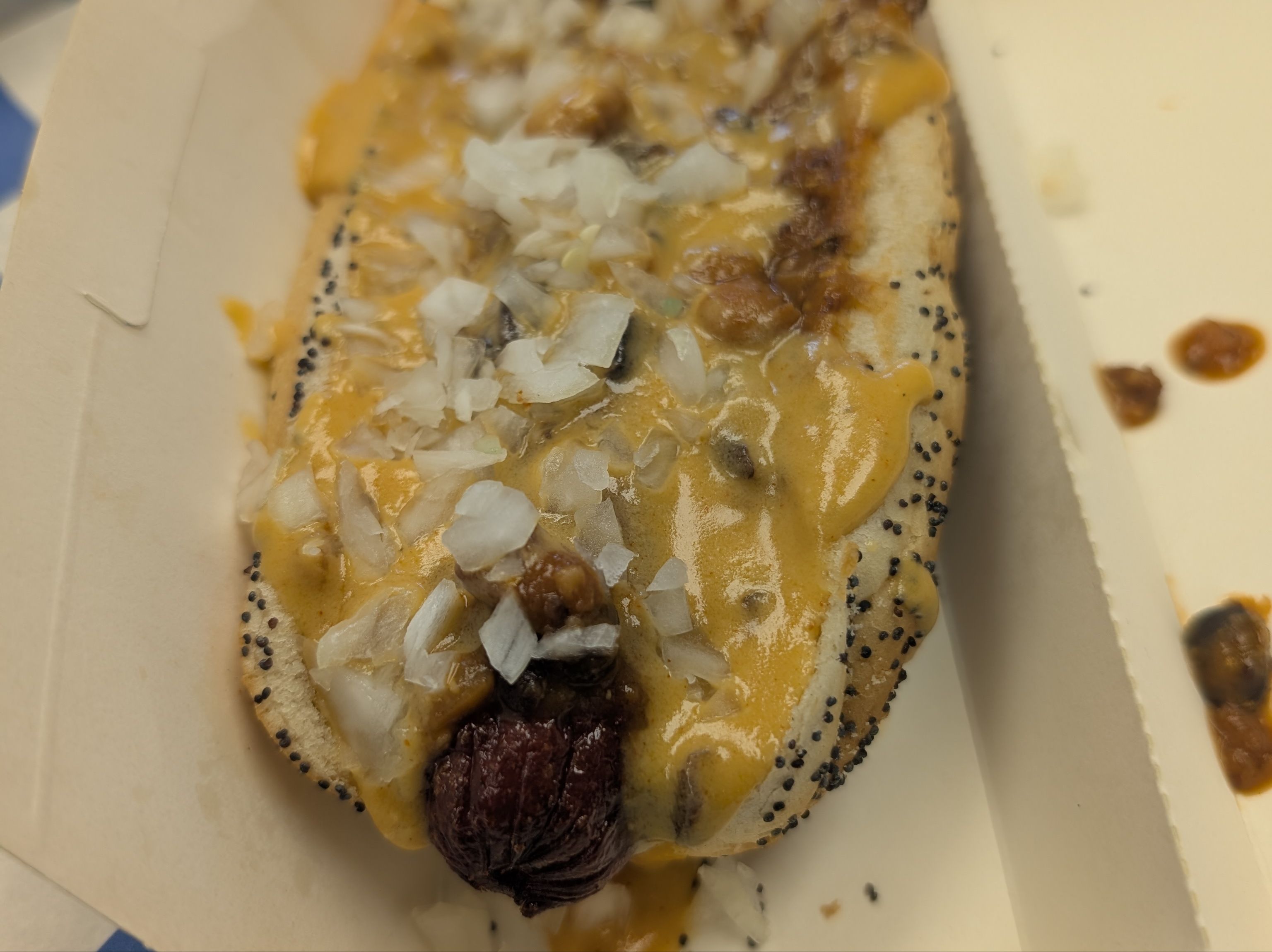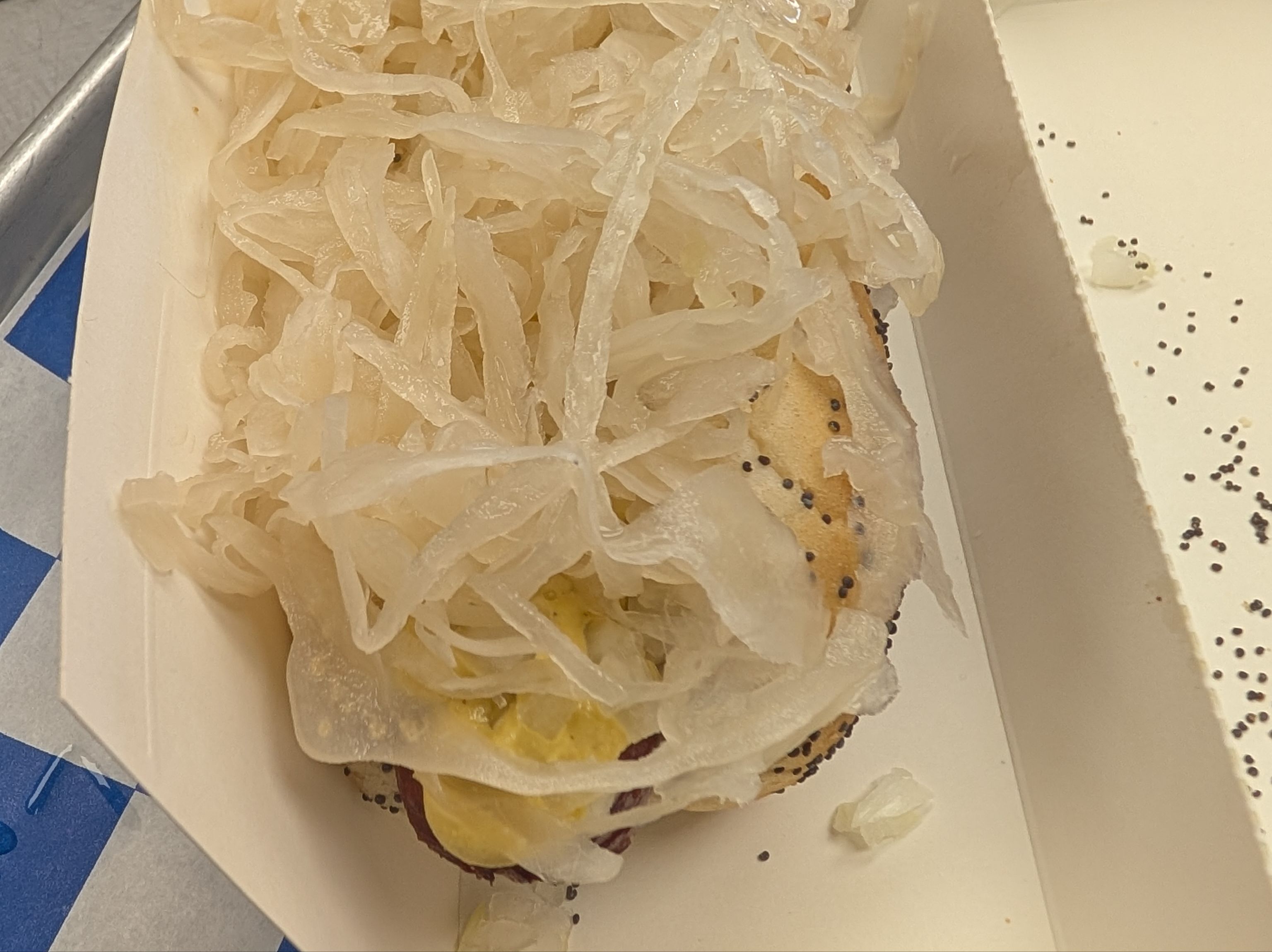 Topped with deli mustard, sauerkraut and sweet onions.